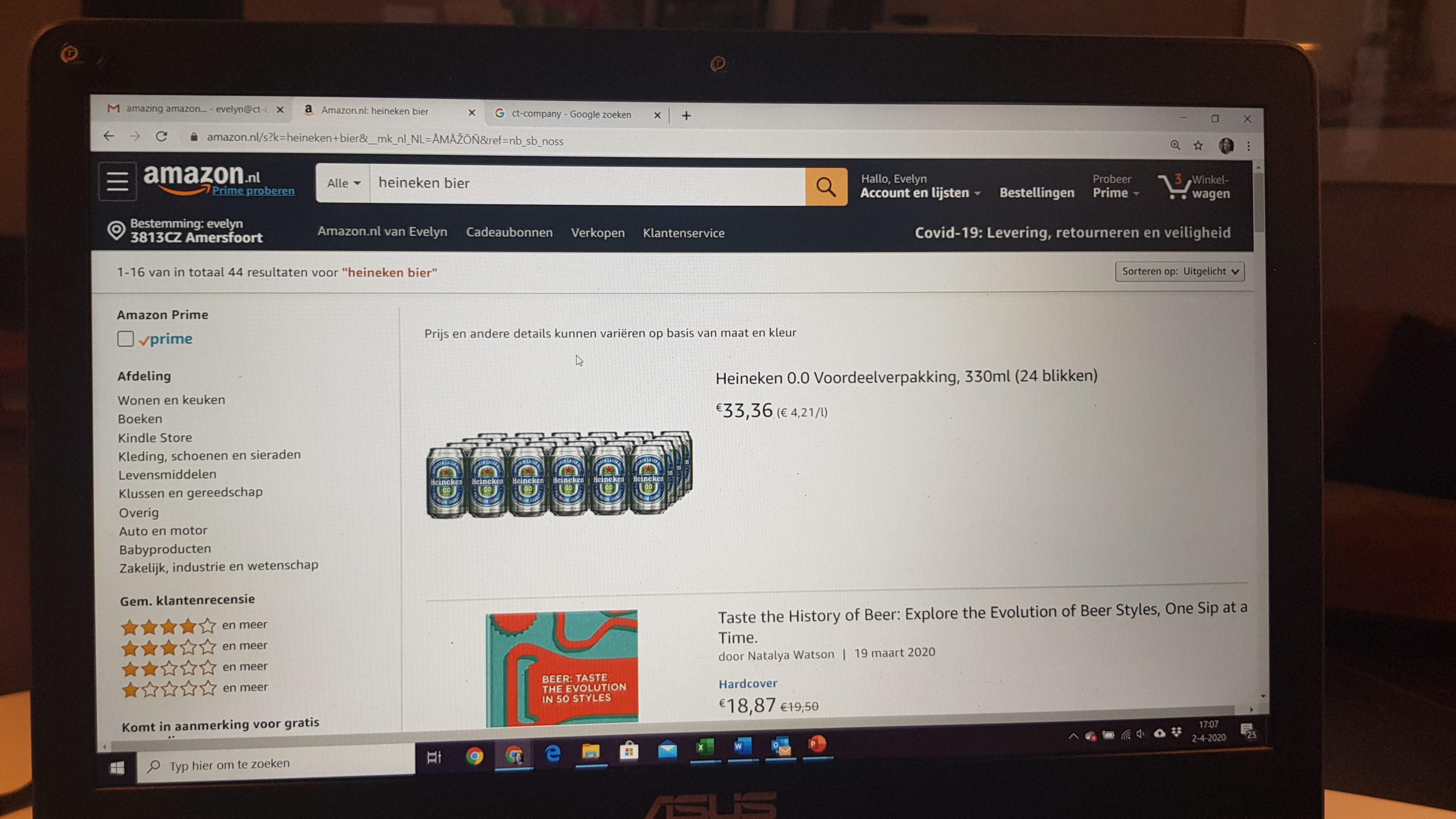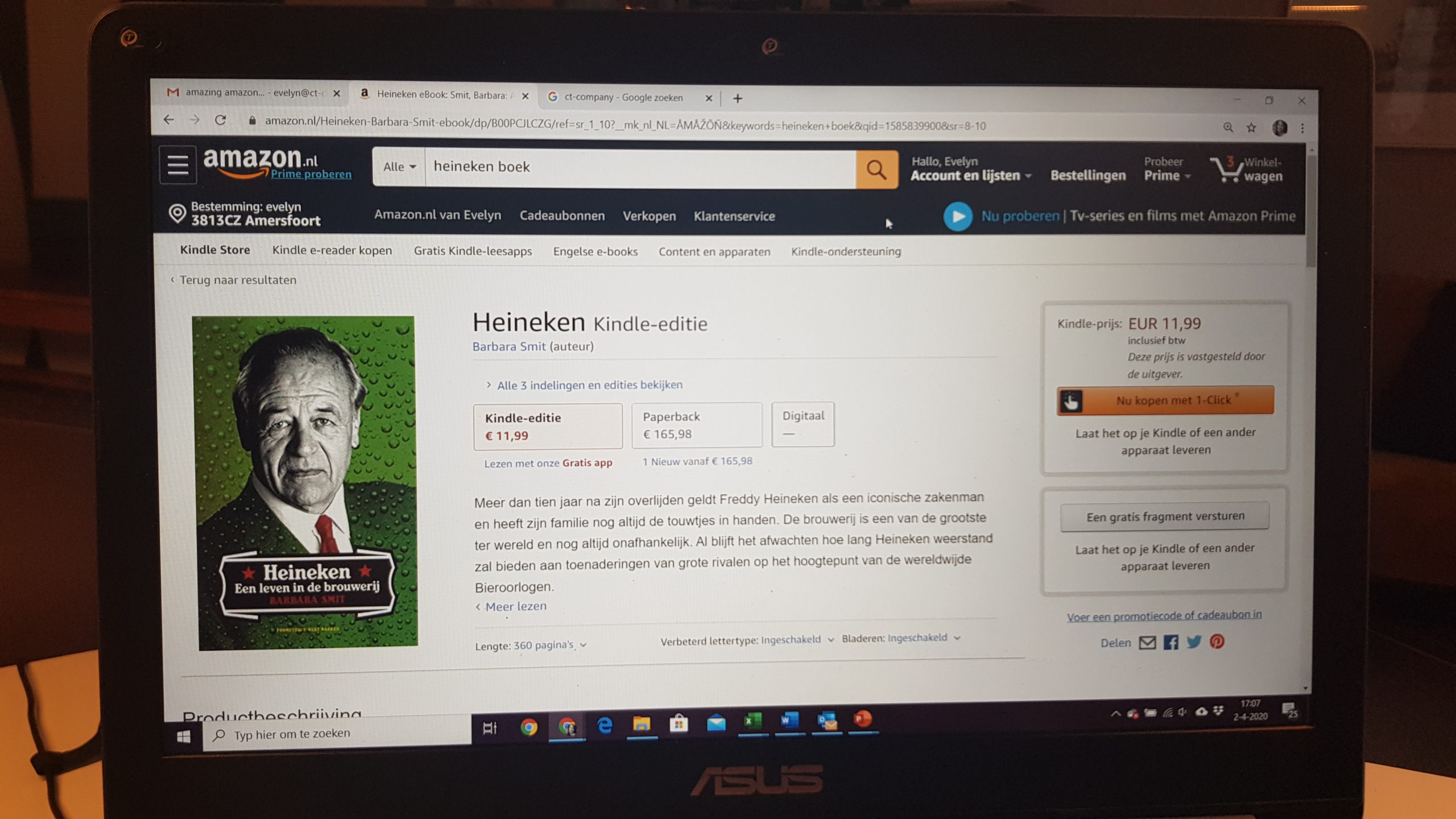 Ook leuk is dat er bij het intoetsen van Heineken ook allerlei andere Heineken-attributen oppoppen: je kunt Heineken-glazen kopen en ‘Heineken-boeken’, een over de ontvoering van Freddy Heineken en de biografie over hem. De biografie kost als e-book € 11,99 en als paperback € 165,98. Nee, dat bedrag is geen typefout.