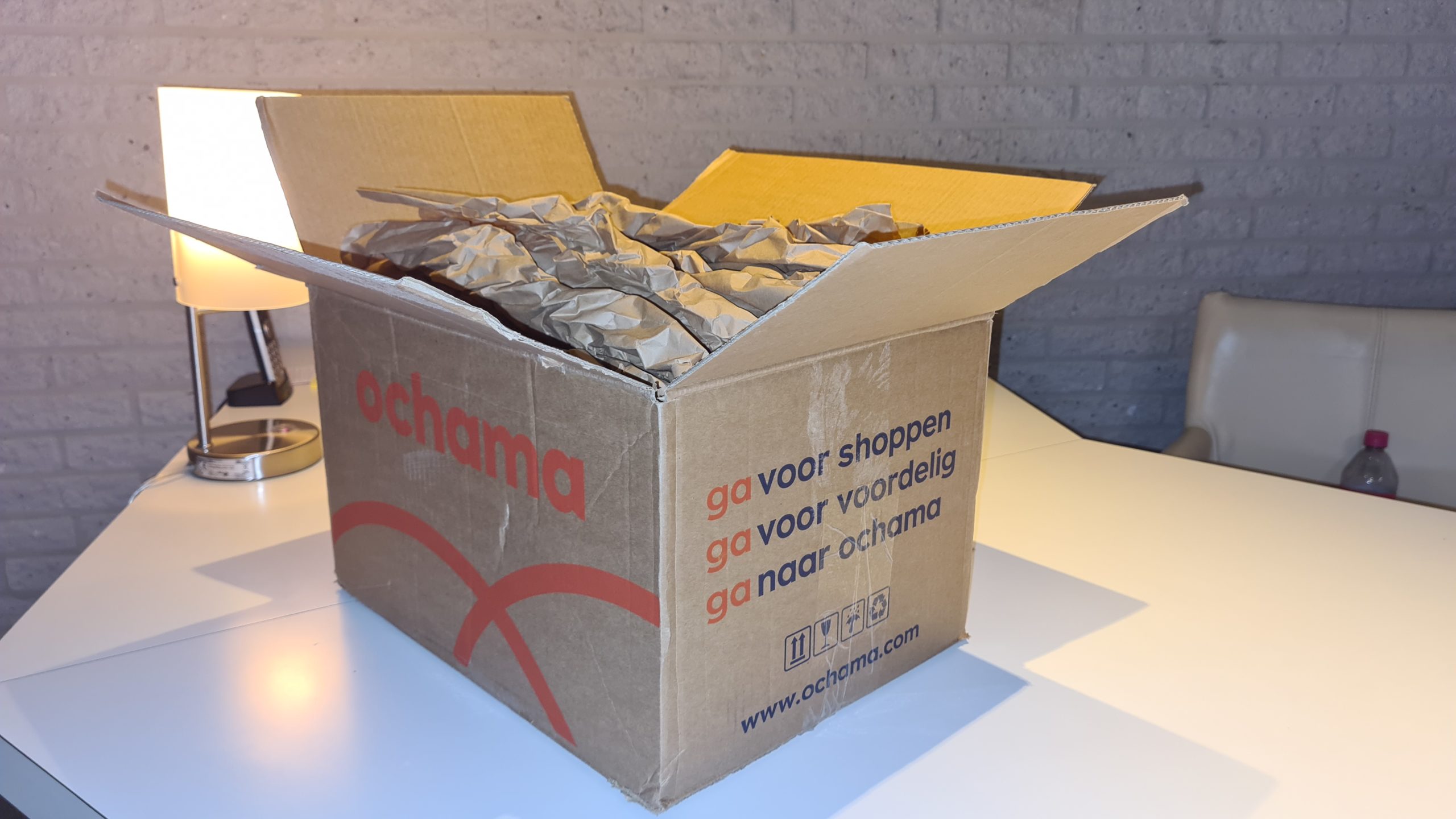 Omdat ik ondanks alle teleurstelling wil ervaren hoe Ochama mij als klant bedient, bestel ik die andere artikelen. Een half uur na de bestelling krijg ik de bevestiging dat UPS het de volgende dag, donderdag, komt brengen. Tussen 11.45 en 15.45 u. Een vrij ruim tijdslot. Op donderdag komt de melding dat het een dagje later wordt, vrijdag dus, tussen 11.45 en 15.45 u. Later op de dag volgt de melding dat het de volgende dag eind van de dag wordt. Uiteindelijk wordt het pakket verrassend genoeg op vrijdagochtend geleverd.