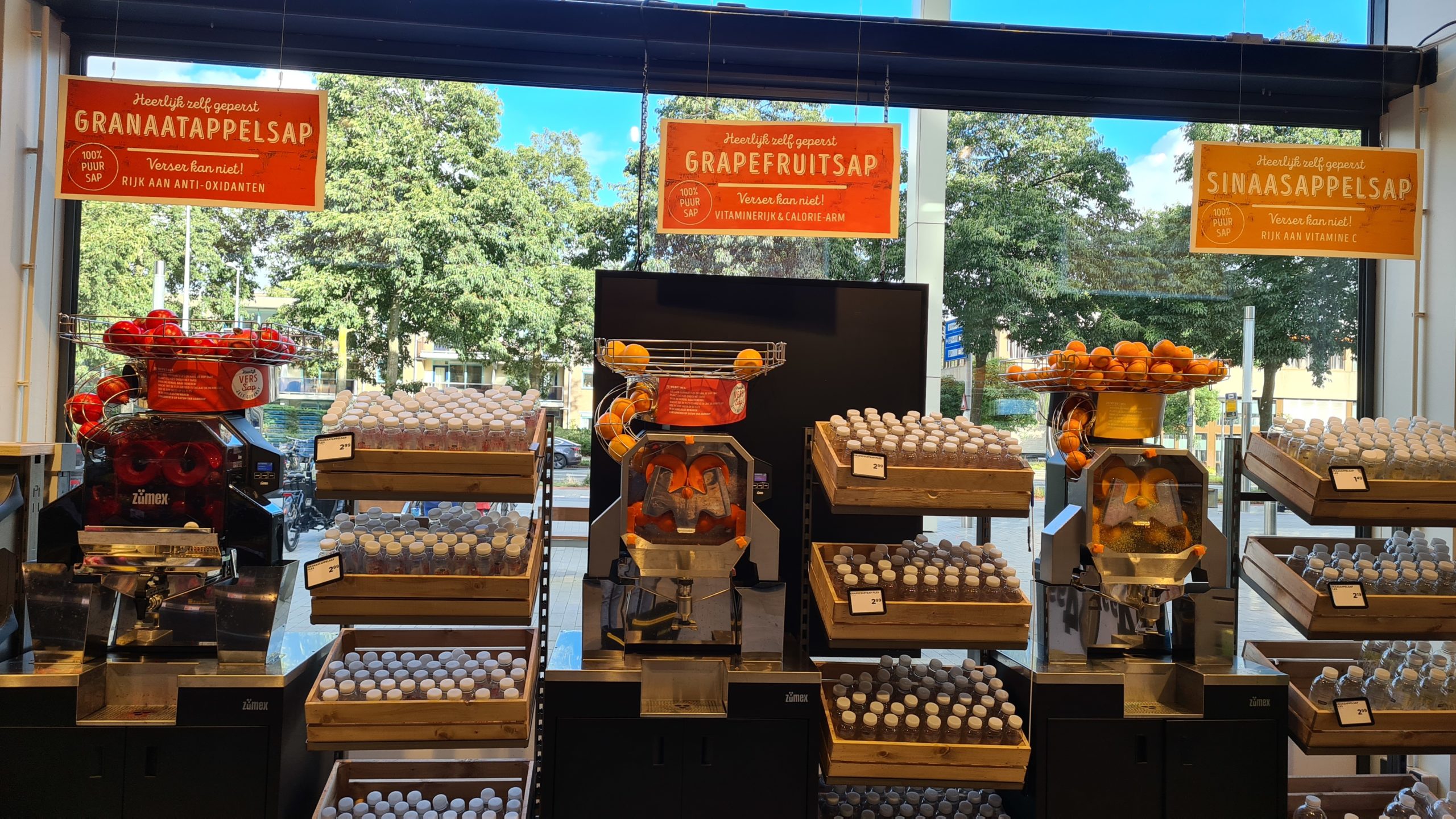 Bij de ingang loop je eerst langs de koffiecorner, aan de buitenzijde, nog voor je de winkel inloopt. Na de poortjes heb je links het onderdeel met verse broodjes, pizza’s, sushi en gegrild pulled-vlees en -kip (alles wat in de winkel bereid wordt). Rechtdoor is de agf-afdeling, met rechts drie persapparaten: voor vers sinaasappelsap, grapefruitsap en granaatappelsap. Ook de voordelen worden toegelicht: granaatappelsap bevat veel antioxidanten en grapefruitsap weinig calorieën. Het ziet er uitnodigend uit en ik neem een flesje granaatappelsap mee. Ik loop door naar de afdeling maaltijden en salades, van verre te herkennen door een muurschildering à la Trader Joe. Naast het bekende assortiment hier ook grote borrelschalen met gesneden groente met dipsaus en gesneden fruit met mascarpone-sinaasappelsaus.