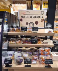 Dan kom ik bij allerlei lekkere afdelingen: ‘met liefde gebakken’, een display met allerlei lekker als verse American cookies, gevulde koeken, suikerwafels, grote stroopwafels, muffins etc. En een nieuwe lijn chocolade van Coco & Sebas, eendjes en hartjes van gekleurde chocolade, mooi om cadeau te geven, te mooi om op te eten, eigenlijk. Ook nieuw voor mij: de thuisafbakbagels in twee uitvoeringen. En een klein schap voor vers brood. Vrijwel alleen halfjes en van ‘gewoon’ tot speciaal koolhydraatarm, stevig, vezelrijk, glutenvrij, La Place… elke Amsterdammer kan hier zijn eigen speciale brood vinden.