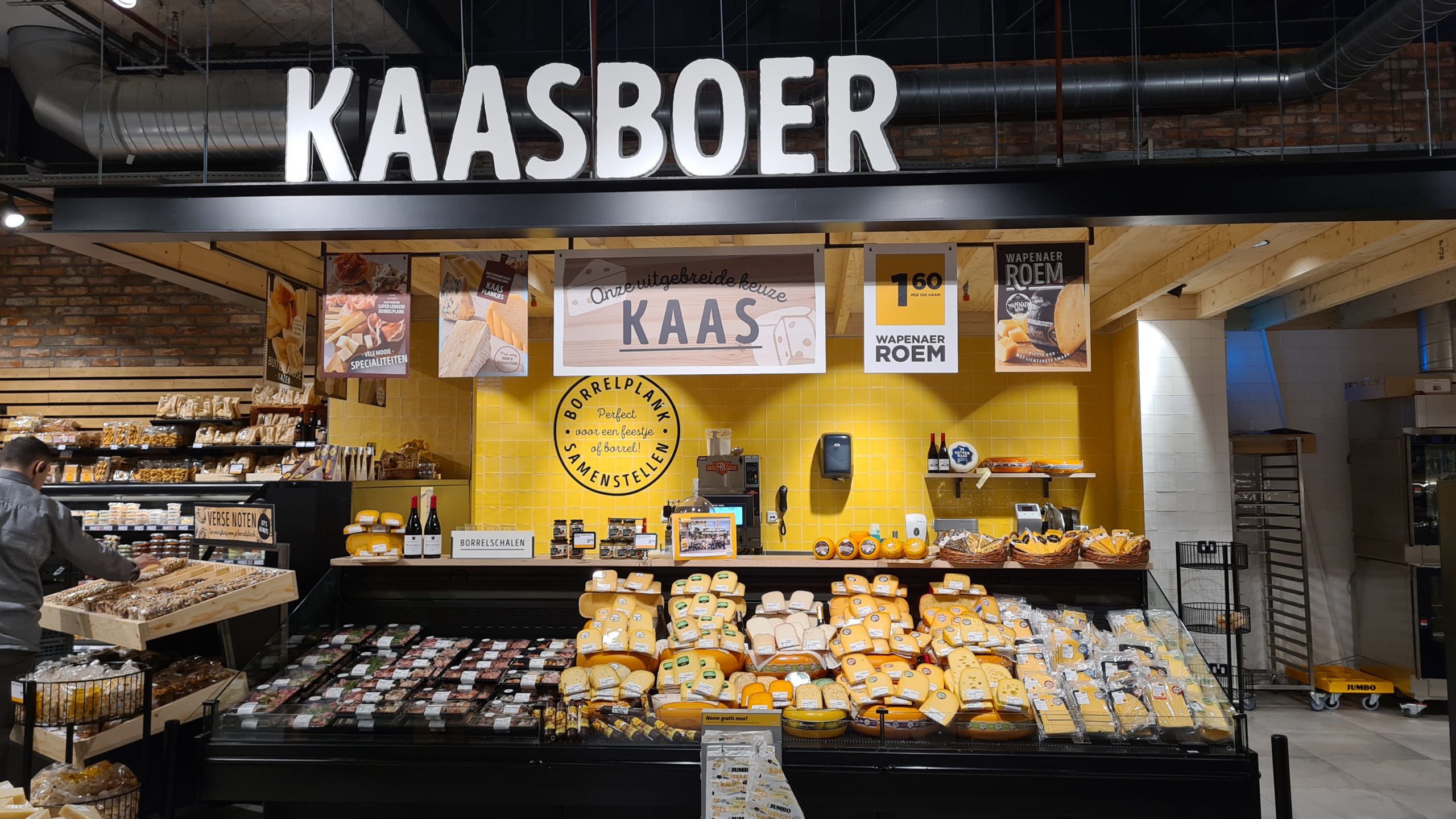 Het eerste dat opvalt is dat het een hele ruime citywinkel betreft: 950 m2. Waar de Jumbo City op minder vvo vaak koos voor een minisupermarkt of een to-go-achtige vestiging, worden deze twee functies hier gecombineerd. De winkel heeft een warme uitstraling, door veel gebruik van hout, gekleurde tegeltjes, bruine bakstenen en muurschilderingen. Ook zie ik opvallend lokaal aanbod én veel verrassend nieuw assortiment.