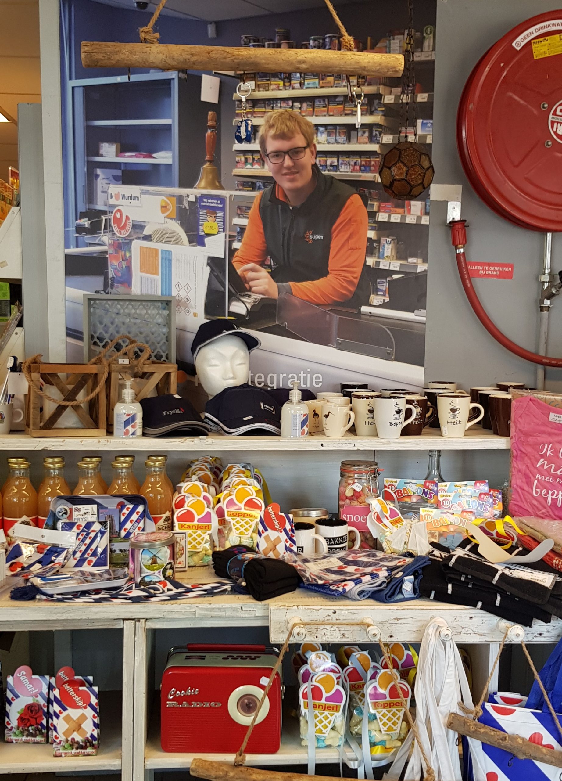 Maar eens een kijkje nemen. Als we binnenkomen is wordt er rechts in de winkel geklust en gebouwd. Daarboven hangt een grote luchtfoto van het dorp Wirdum met de kerk als centraal middelpunt. Vervolgens komen we voordat we bij de groente en fruit komen eerst een vitrine met gebak en een display met de lokale kruidenbitter ‘Het enige echte Wirdumer slokje’ tegen. Door de hele winkel vinden we lokale of streekassortimenten, zoals de droge worst. Er staat een display met wat Friese producten geschikt als cadeautjes, mokken met ‘Heit’ (vader) en ‘Beppe’ (oma) en koekje met ‘Beterschap’ of ‘Zomaar’ erop. In de schappen staat een compact assortiment, met onder andere het huismerk Gewoon van Superunie. Er is een koelkast met gekoeld bier.