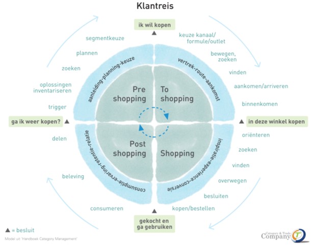 Post shopping fase: Het product gaat gebruikt worden door de shopper / consument. Bijvoorbeeld het boren van een gat in de muur, of het maken van het recept voor het gezin. In deze fase wordt het belangrijk om te weten of er ondersteuning nodig is bij het gebruik. Denk hierbij aan een recept of een video die een bepaalde bereidingswijze laat zien. Is de consument genegen om haar ervaringen te delen? Met vrienden en familie, maar ook met de retailer en leverancier (bijvoorbeeld bij klachten). Aan het einde van deze fase neemt de shopper het laatste besluit in de reis, namelijk of hetzelfde product nogmaals gekocht gaat worden en nogmaals bij dezelfde retailer. Hiermee is de cirkel rond en zal dit de aanleiding zijn om weer in de pre-shopping fase te starten.